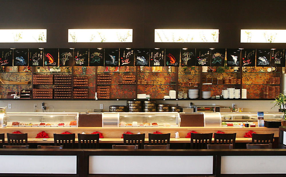 Koryo Interiors crafted Tomo Sushi with a luxurious ambiance, employing rich dark tones in the crown molding, custom-made booths, and floor tiles, with sophisticated red benches adding a touch of refinement to the overall setting.